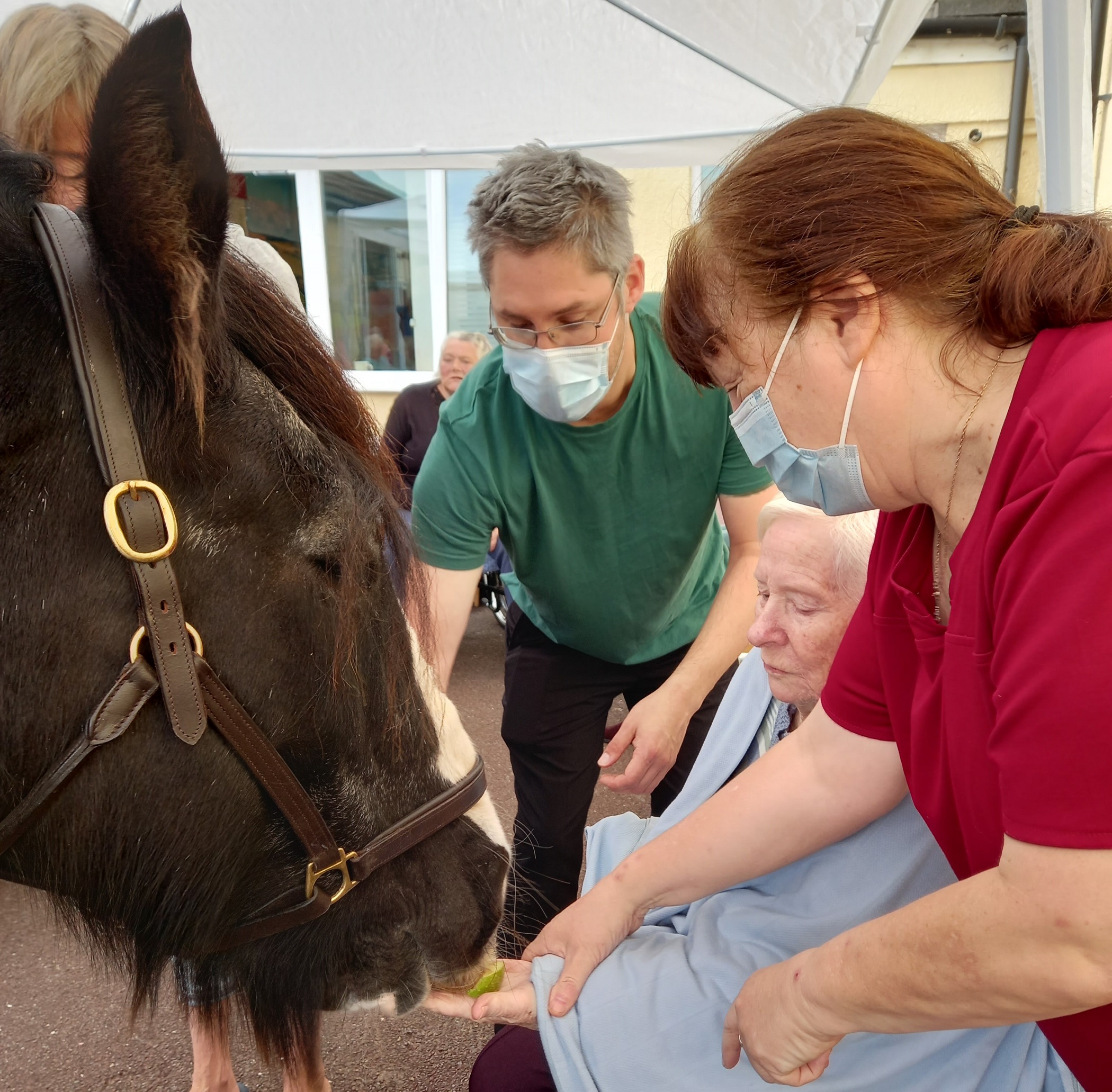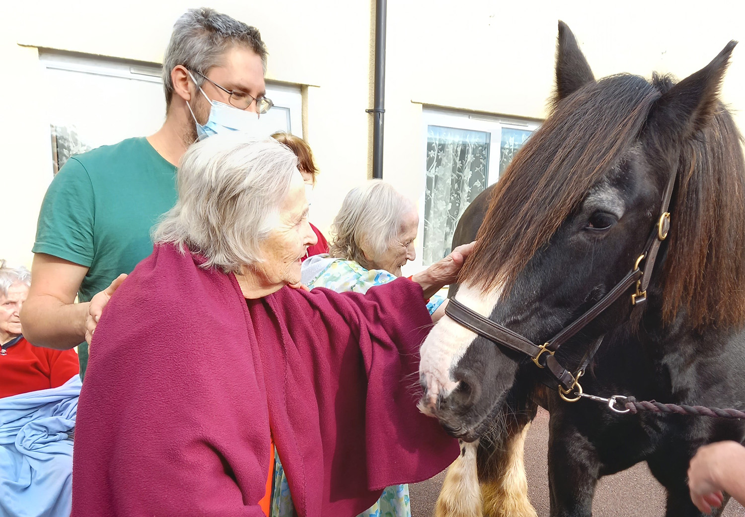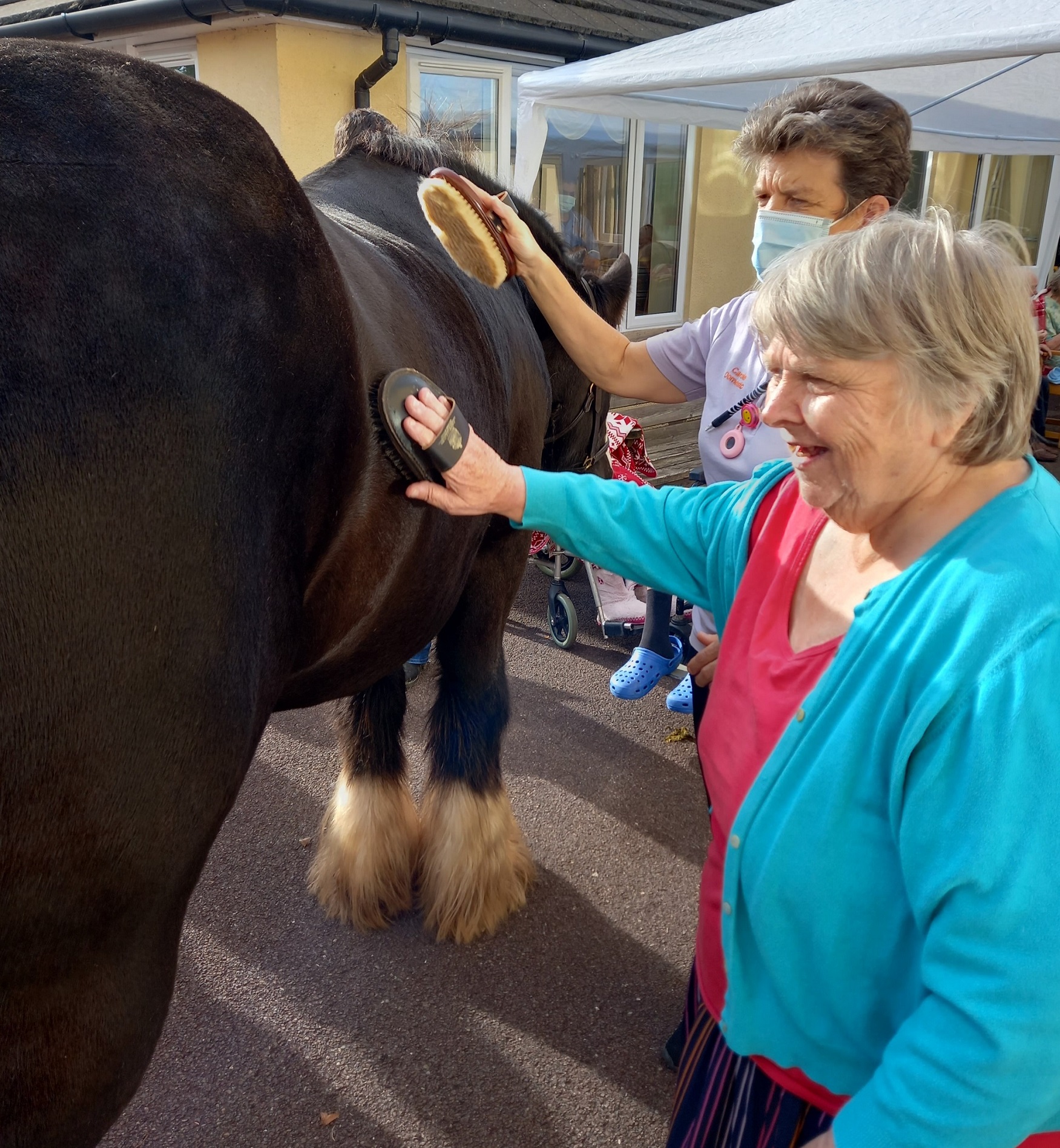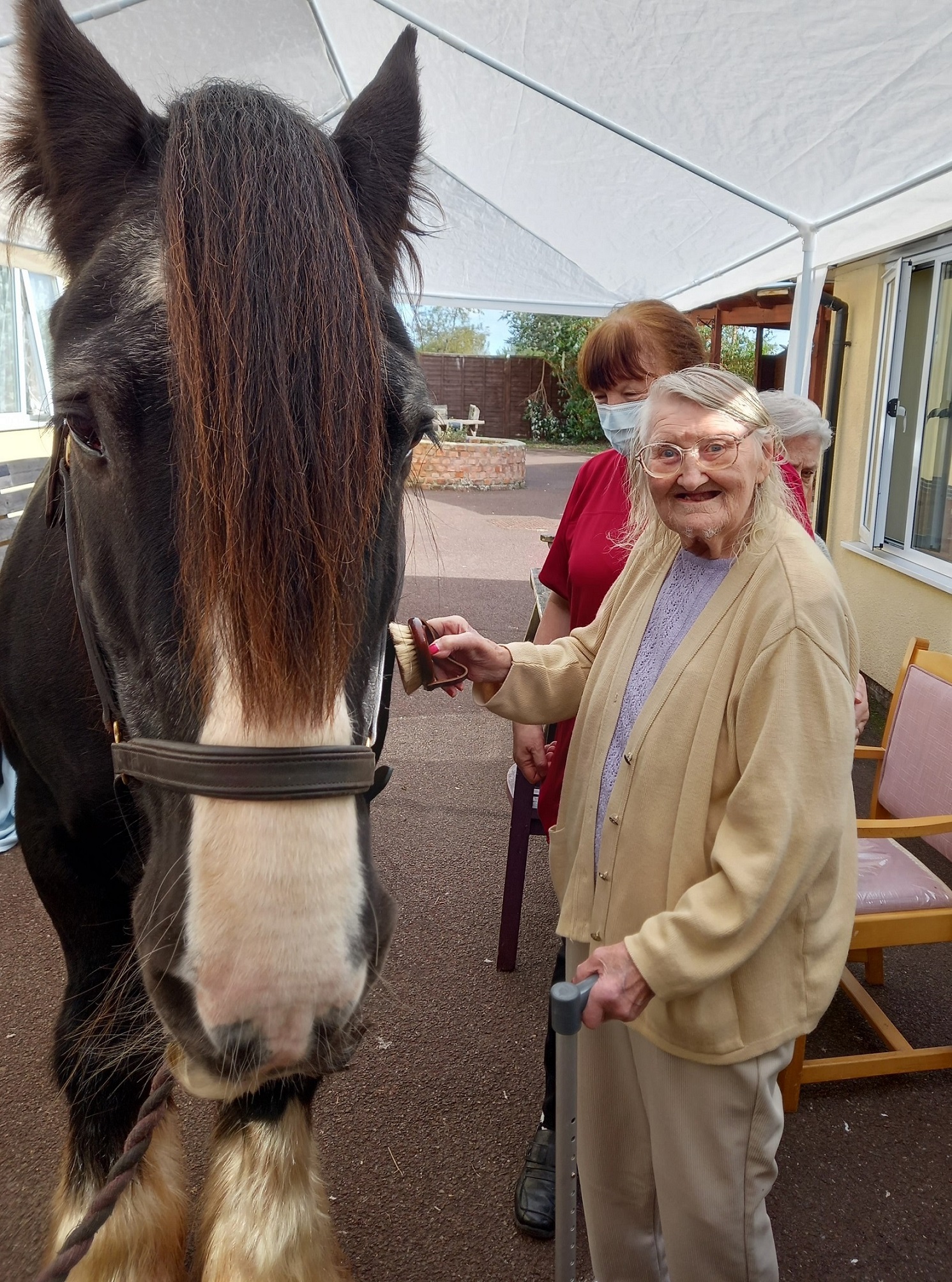 Residents of a specialist dementia care home in Wellington, Somerset, have been thoroughly enjoying themselves in the company of Captain, an Irish Cob horse, who was brought to visit them in the garden of the home.