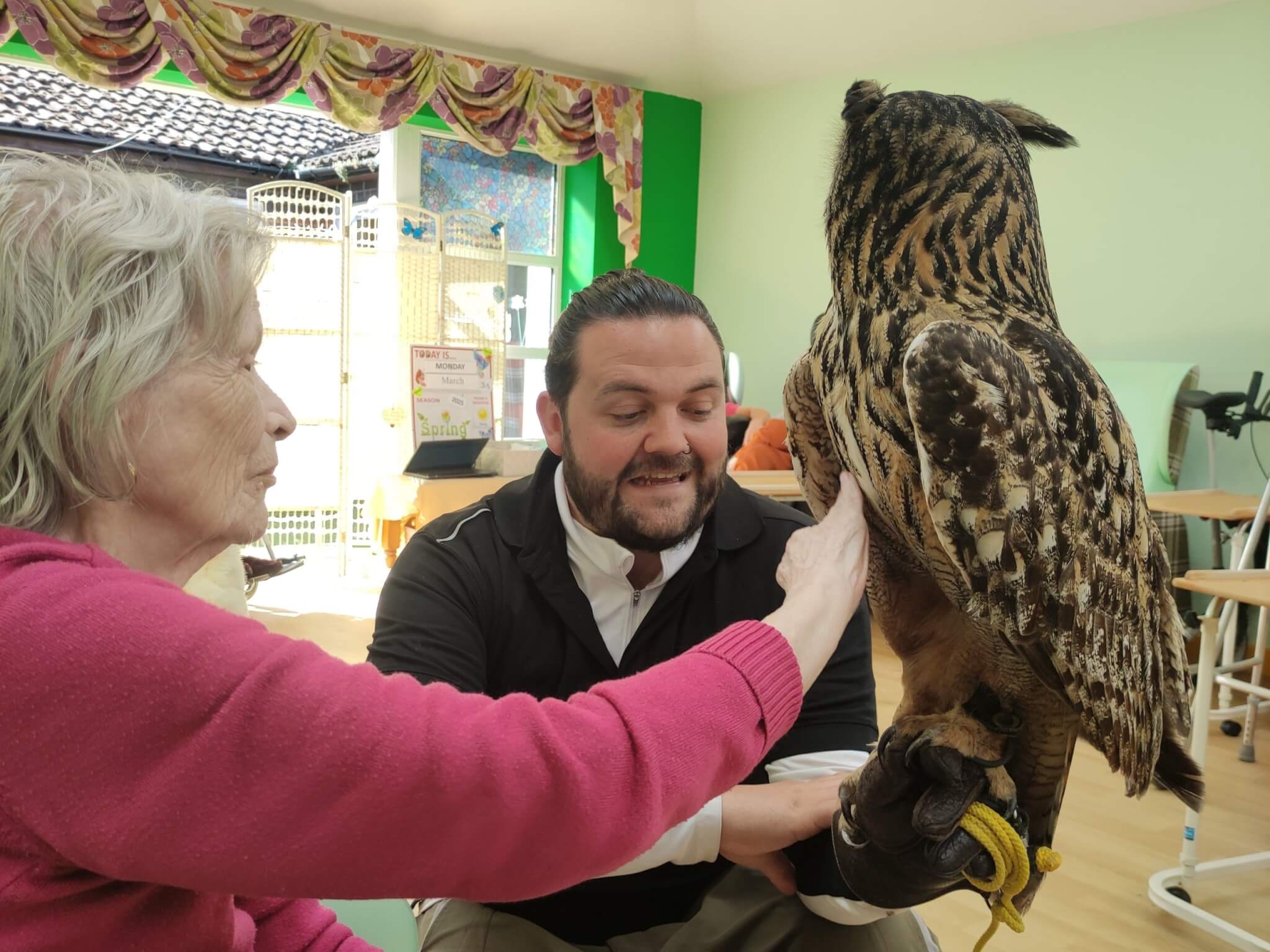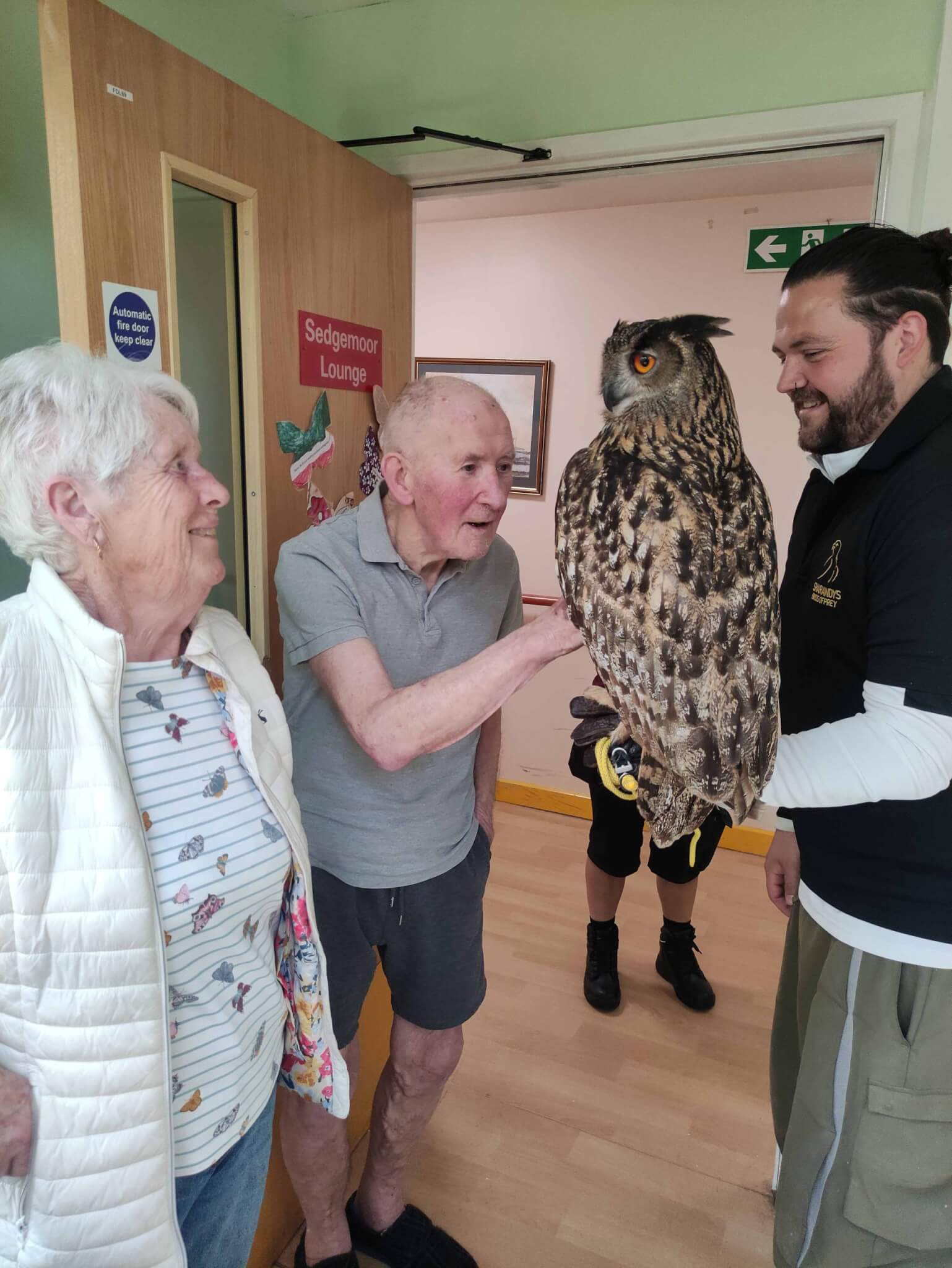 They got to meet Guinea the eagle owl, Bracken the tawny owl, Cobweb the barn owl, and Floci the falcon as part of the home’s regular pet therapy programme.