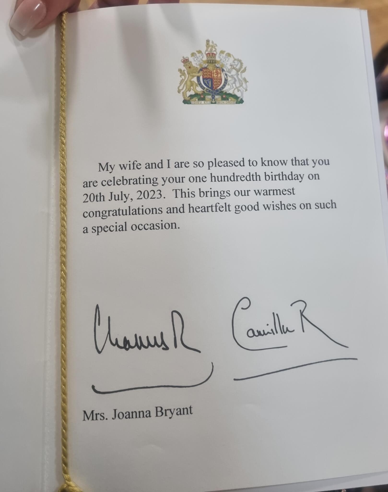 Plymouth resident Joanna Bryant was thrilled to receive a birthday card from King Charles and Queen Camilla when she celebrated her 100th birthday last week.