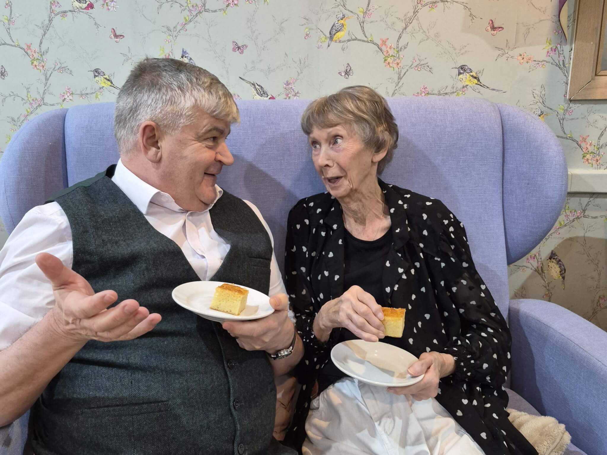 Main photo: Graham Oakes and resident Doreen Harvey enjoying one of Jithin’s cakes