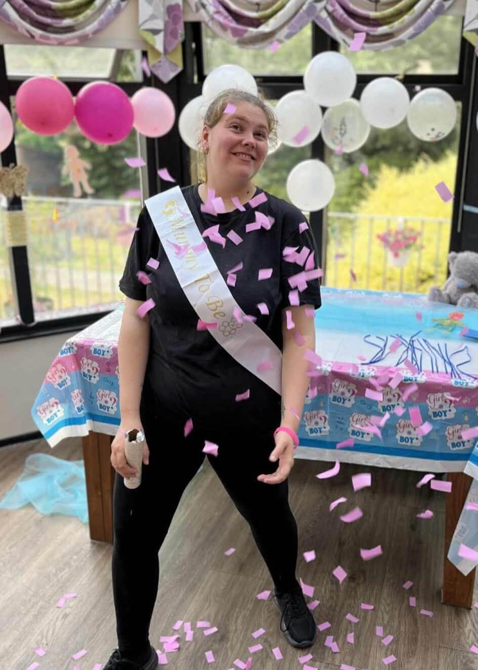 The reveal was done by Chloe letting off a small cannon which fired pink confetti into the air.