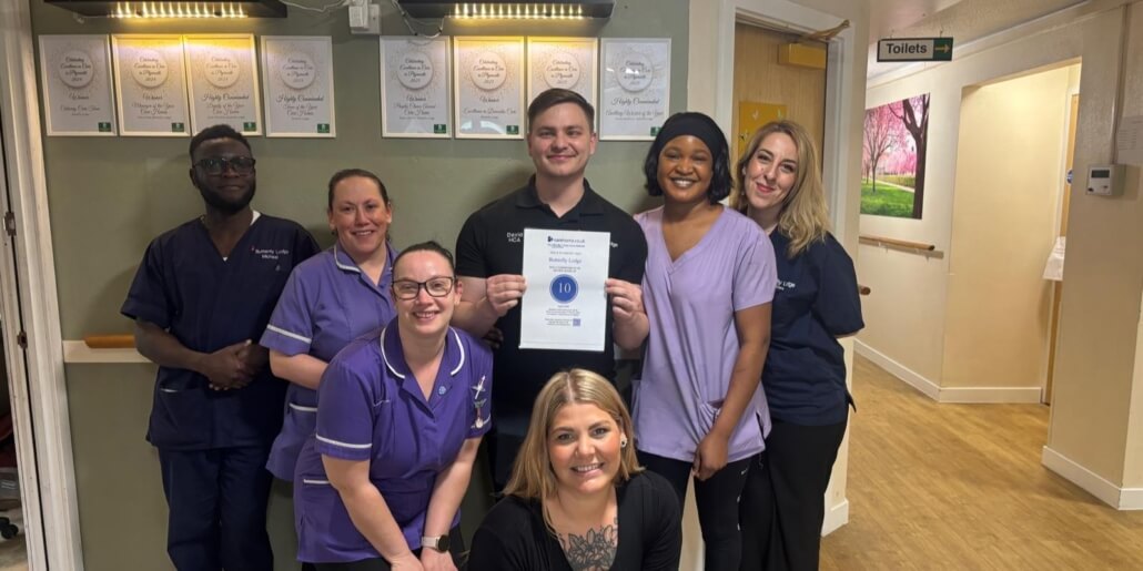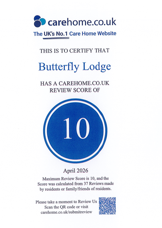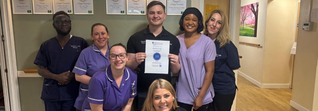 Staff at Butterfly Lodge are celebrating the news that they have been awarded the highest possible score by carehome.co.uk for the care they provide, due to the very positive feedback submitted to the care sector’s industry-leading website by residents’ families.